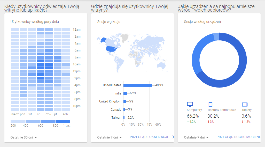 Raport danych na temat ruchu i użytkowników Twojej witryny: źródeł pozyskania, urządzeń, lokalizacji i demografii, oraz sesji średniej długości sesji i liczby odsłon na sesję