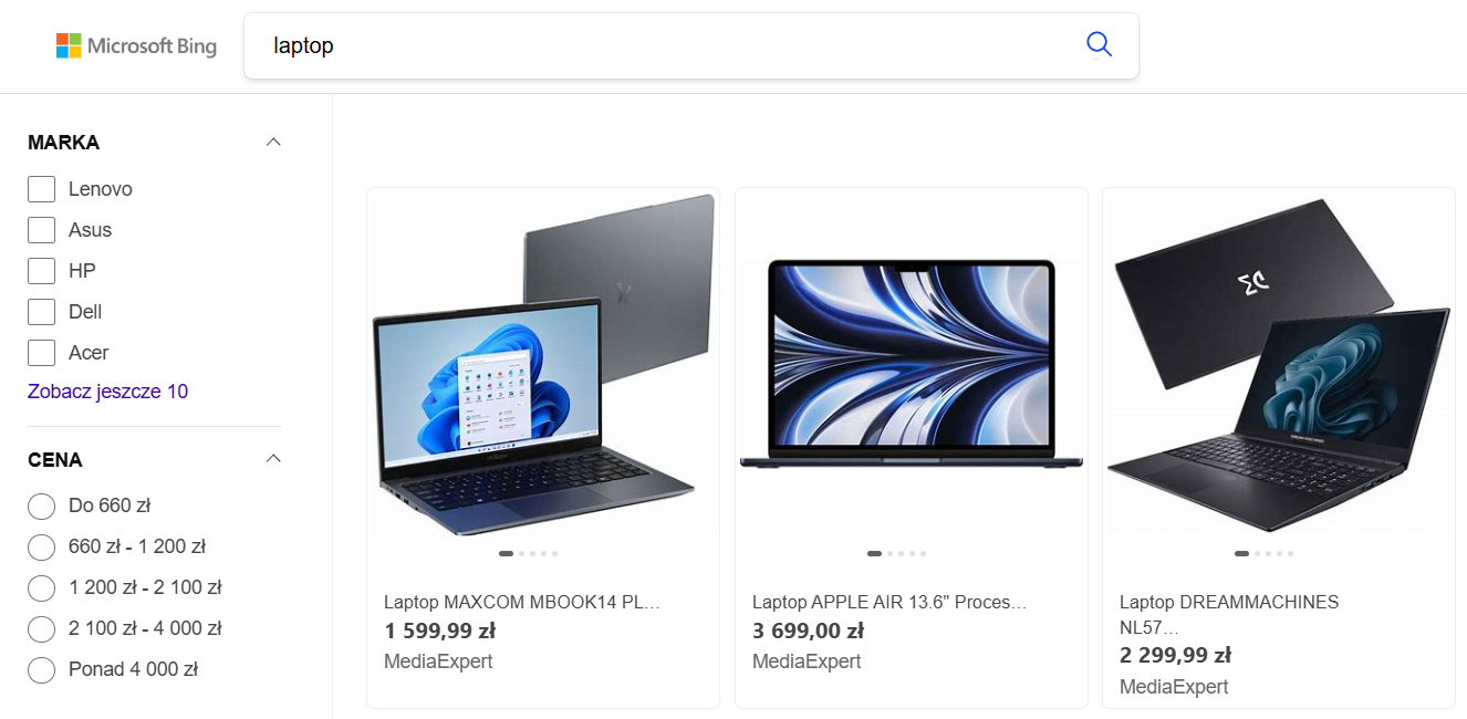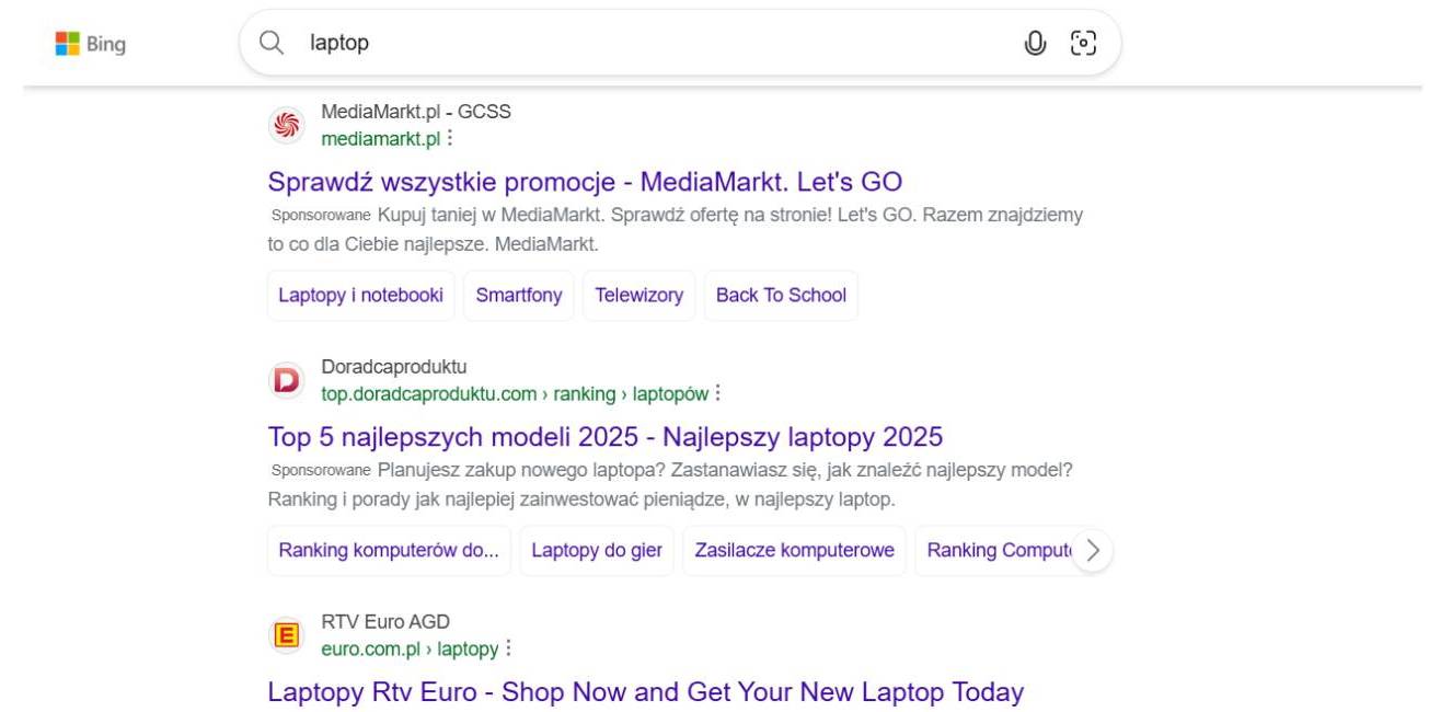 Reklamy produktowe w Bing Ads to idealne rozwiązanie dla sklepów internetowych, które chcą prezentować swoją ofertę w atrakcyjny i wizualny sposób. Produkty pojawiają się w wynikach wyszukiwania wraz ze zdjęciem, ceną i nazwą sklepu, co przyciąga uwagę użytkowników i zwiększa prawdopodobieństwo kliknięcia. Bing Ads personalizuję zapytania użytkowników aby zwiększyć ilość kliknięć, wspierając sprzedaż konkretnych produktów, co czyni ją efektywnym i opłacalnym kanałem promocji dla e-commerce.